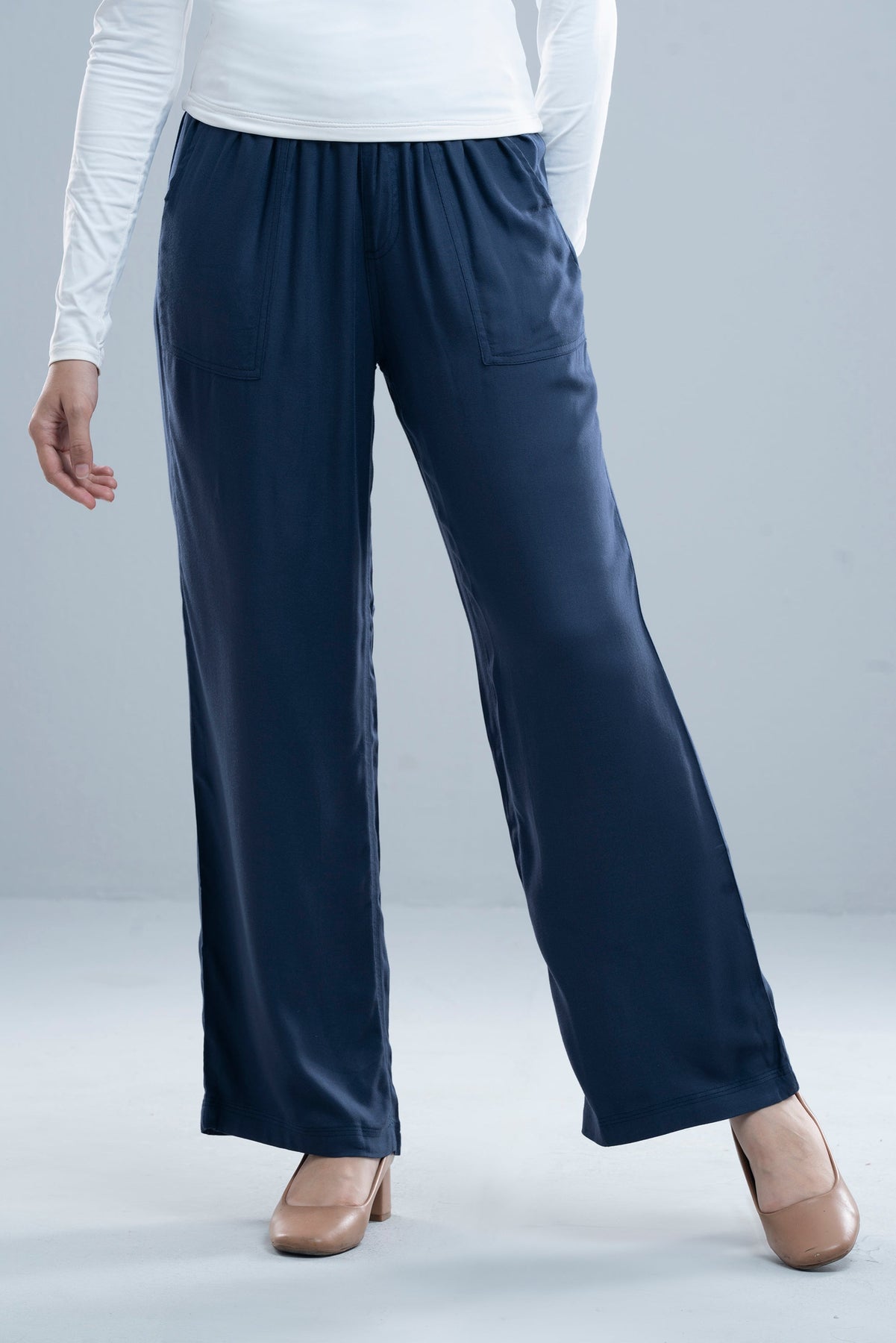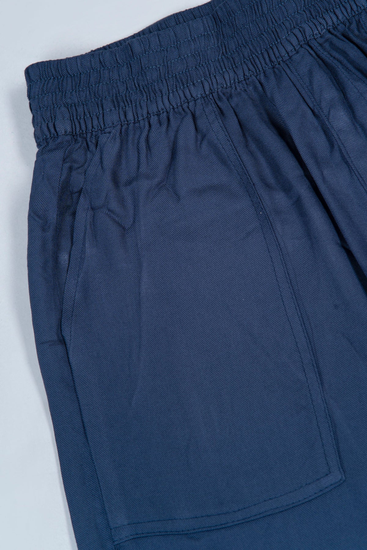 This loose-fitted women's twill pant combines everyday comfort with subtle style. Made from soft, shiny-surfaced fabric, it features an elasticated waistband for ease of wear. Designed with front patch pockets, a back flap pocket, and triple-needle stitch detailing, this pant offers both function and a modern utility look perfect for casual or relaxed styling.